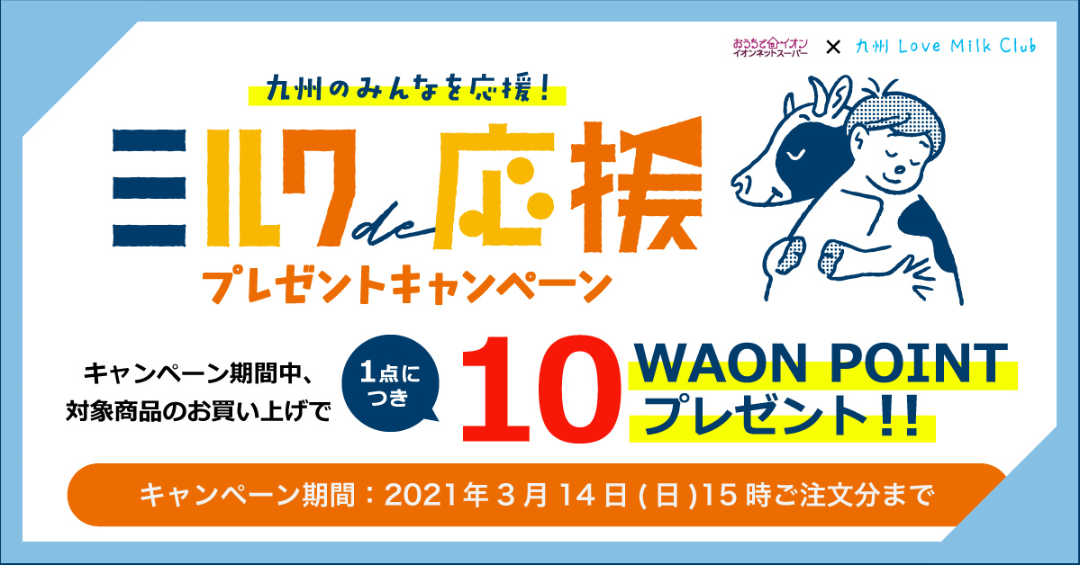 イオン九州さんのネットスーパーで、キャンペーン対象の牛乳を購入していただくと、対象商品1点につき WAONPOINTを10ポイントプレゼントします!